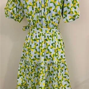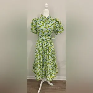 Embrace elegance with this stunning floral dress. Featuring a vibrant green and blue pattern, this dress is perfect for any occasion. Enjoy the comfort and style it brings to your wardrobe. Button front bodice, matching belt, 2 functional pockets.