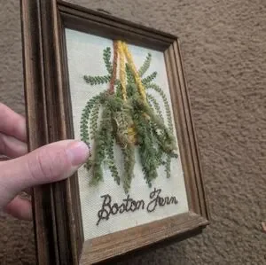 Fiber art wall hanging depicting a Boston fern in textured green yarn. Yellow and tan hanging cords add contrast. Hand-stitched name detail grounds the piece. Simple, nature-inspired textile decor.