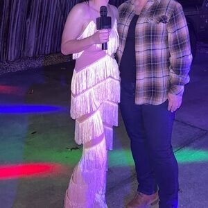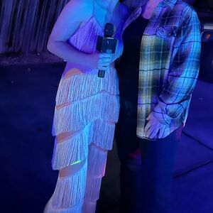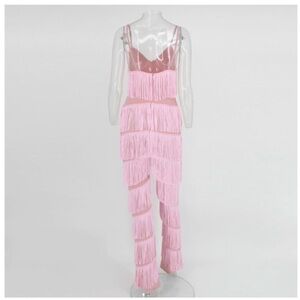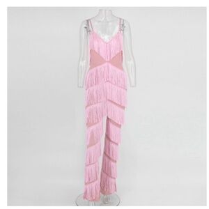 A statement jumpsuit with layered fringe for movement and texture. Spaghetti straps and a V-neck create a flattering silhouette. Finished in a dusty pink hue for a soft, feminine look. Perfect for parties and evening events. Fits more like a small too tight for me, please see all pictures!