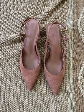 Pointed-toe slingback heels in soft suede. Low kitten heel for subtle lift. Adjustable strap with a small buckle. Minimal, versatile silhouette for many outfits.