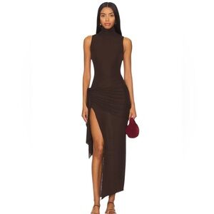 A sleek brown sleeveless dress with ruched detailing and a dramatic side slit. The brown color creates a refined, versatile look. Designed to flatter the silhouette and move gracefully for evening or special occasions.