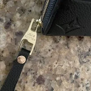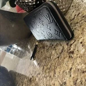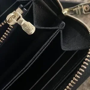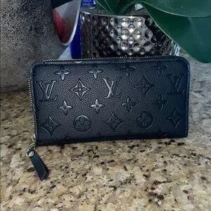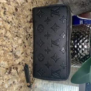 Elegant zip-around wallet with embossed inspired Louis Vuitton monogram. Smooth faux leather exterior with tonal monogram pattern. Gold-tone zipper hardware and pull. Sleek design for daily use.