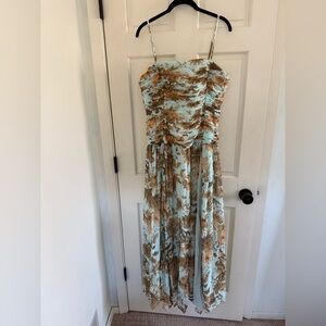 Strapless Floral Ruched Maxi Dress in Light Blue and Tan