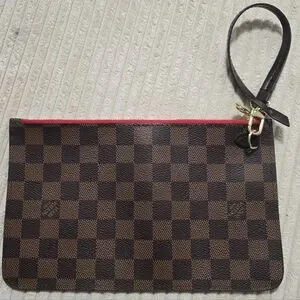 Brown checkered wristlet pouch. Red zipper trim and dark brown leather strap with gold hardware. Compact and stylish clutch for everyday use.