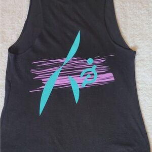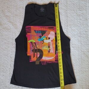 Stylish Peloton tank top with vibrant graphic design. Features a mix of colors on a black base.
