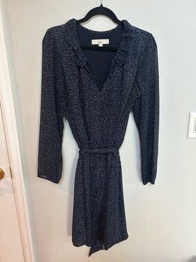 Ann Taylor LOFT Navy and White Printed Ruffle Long Sleeve Dress with belt