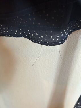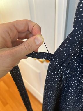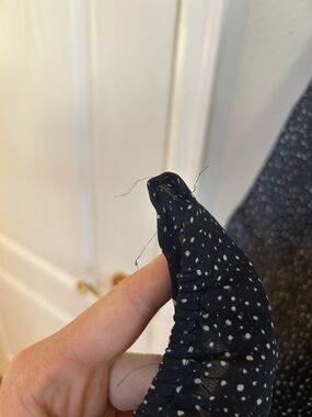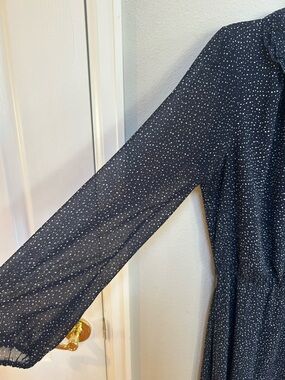Feminine dress with subtle white dot print. Ruffled V-neckline and long sheer sleeves. Self-tie waist for shape. Flowing skirt for easy movement. Classic, versatile styling. There is some fraying along edges and seams (see pics)