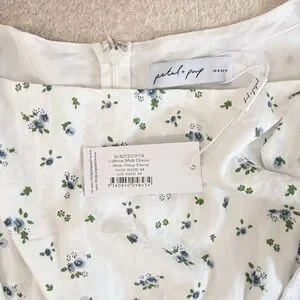 Gorgeous feminine white maxi dress with delicate blue floral print. Smocked waist provides a flattering fit. Tie-shoulder straps add a feminine touch. Versatile and easy to wear for warm-weather spring/summer outings. Brand new with tags sold out on Petal and Pup website. Size Medium.