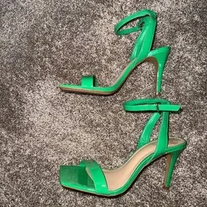 Sleek green ankle-strap heels with a square toe. Single front strap for a minimalist look. Adjustable buckle secures the ankle. Smooth finish for a polished appearance.