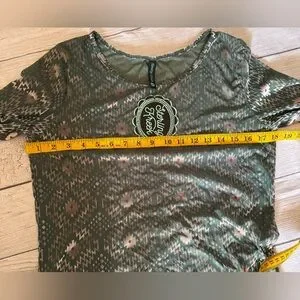 Boutique Sterling Kreek “Make It Reign” top in a soft sage green with silver Aztec/geometric print.