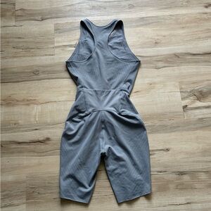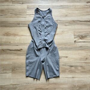 Sleek gray sleeveless jumpsuit with a front zipper for easy on and off. Stretchy, ribbed fabric provides comfortable support and a flattering fit. Versatile piece for workouts or casual wear. Gray color offers a neutral, modern look.