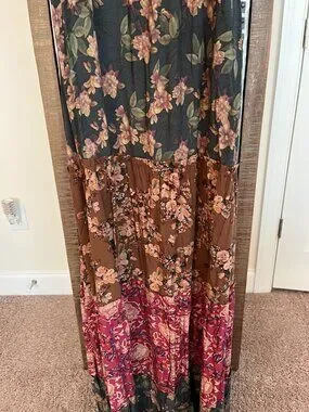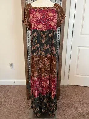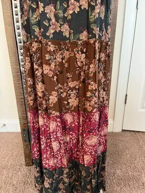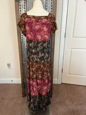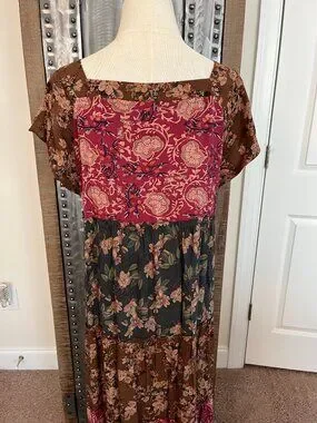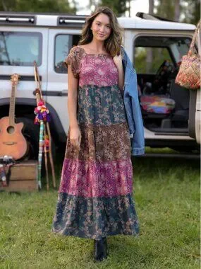 Experience the ultimate bohemian dream with the Natural Life Berkley Maxi Dress (SKU: LHDRS003579). Known for its effortless "throw on and go" style, this dress features a stunning patchwork of mixed floral prints in rich autumnal tones of mauve, terracotta, and deep forest green. Square neckline, short flutter-style sleeves, and four tiers of flowy fabric for a relaxed, voluminous silhouette.
