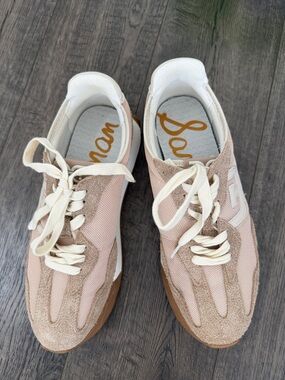Sam Edelman Langley3, Tan Mesh Suede sneakers with cream laces cushioned insole and gum rubber outsole. Size 8.5 M. Added photos of all wearing sings and marks! Have original box.