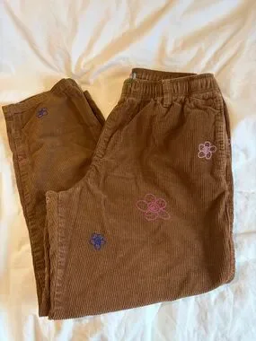Brown corduroy wide leg pants from Urban Outfitters. Elastic waist and relaxed fit. Multicolored embroidered flowers for a playful touch. Soft textured fabric for casual wear.