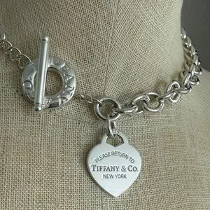 Classic Tiffany & Co. heart tag pendant on a polished silver toggle chain. Chunky soldered links. Signature engraved heart detail. Bold link chain for a statement look. Versatile piece for daily wear.