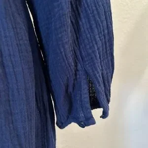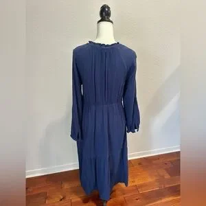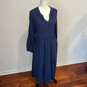 Effortless navy tiered midi dress with long sleeves and a soft V-neck. Lightweight, textured fabric provides comfortable all-day wear. Subtle ruffle trim adds a feminine touch. A versatile wardrobe staple in timeless navy.