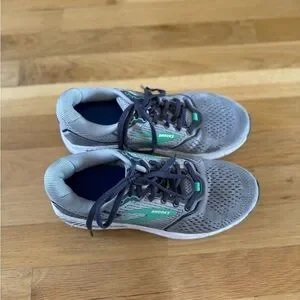 Stylish Brooks sneakers. Gray mesh upper. Green accents. Comfortable and durable.