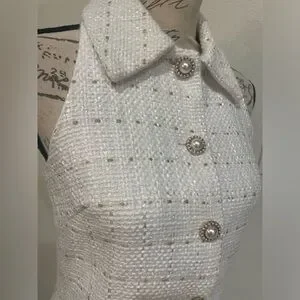 Chic and timeless, this Hutch dress is the perfect mix of classic and modern style. The perfect mix of trendy and classic! The sleeveless halter cut, collared neckline, and statement buttons make it a standout piece, while the ivory tweed with a hint of shimmer adds just the right amount of flair. Easy to dress up with heels or keep casual with sneakers or sandals — a versatile must-have for your closet.