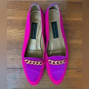 Vibrant two-tone fuchsia and magenta loafers by Stuart Weitzman. Gold-tone chain across the vamp adds luxe detail. Soft upper with classic slip-on shape. Eye-catching color for bold outfits.