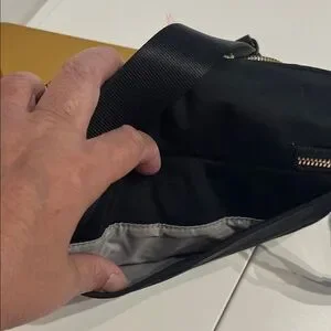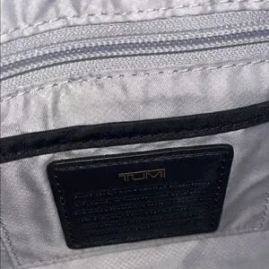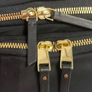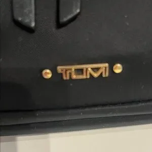 Compact Tumi belt bag in black nylon. Gold-tone zippers and hardware accent the exterior. Front zip pocket and main compartment for essentials. Adjustable strap for hands-free wear. Sleek, travel-ready design.