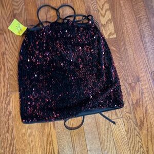 Sparkling sequin mini with black base and red shimmer. Thin strappy neckline. Fully sequined front for a party-ready look. Sleek and eye-catching.