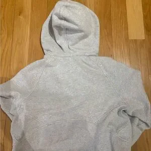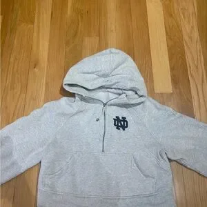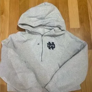Light grey pullover hoodie with a front half-zip. Features a navy interlocking "ND" logo on chest. Comfortable casual style. Soft fabric and kangaroo pocket.