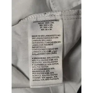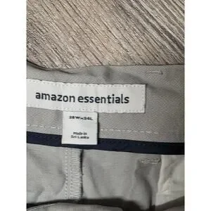 Amazon Essentials men's chino pants in a size 38W x 34L. Light gray/stone color. Features a flat front design, straight leg fit, front slash pockets, and button-through rear welt pockets. Made from a comfortable and durable 60% cotton, 40% polyester blend. Excellent pre-owned condition, crisp and ready to wear. Perfect for business casual or everyday wear.