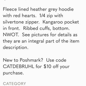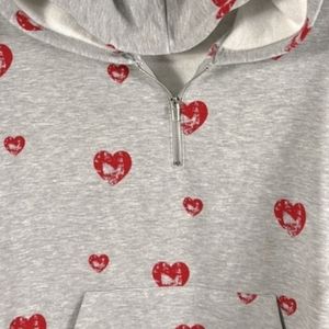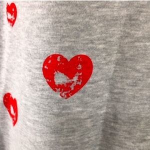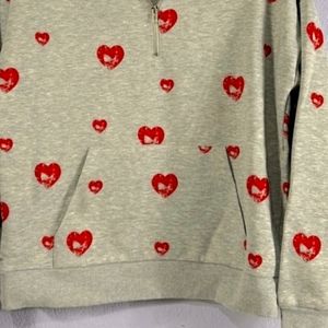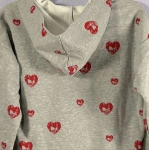 Size Large heart stamped hooded top with kangaroo pocket in front. Grey with red hearts. NWOT. See pictures for details as they are an integral part of the item description.
