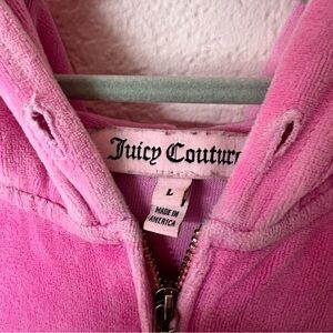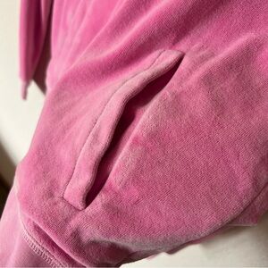 Y2K 2000s mcbling old school bubblegum pink juicy couture velvet zip up with bling rhinestone J zipper - labeled size large - good condition, hoodie string missing, some rhinestones missing and some light flaws throughout (examples pictured)