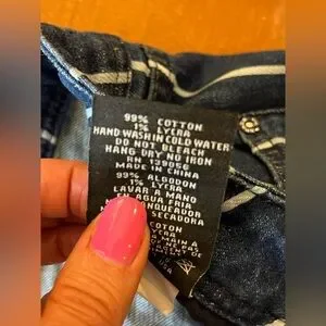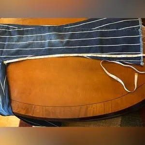 Medium blue wash with white vertical stripes and a raw, frayed hem.