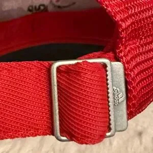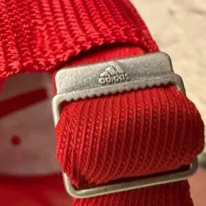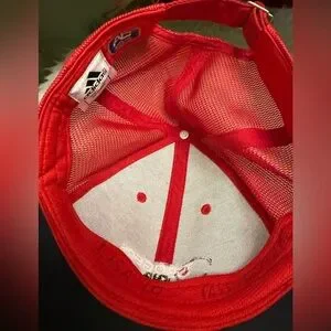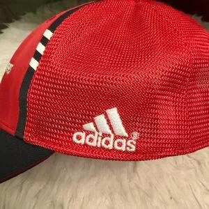 Vibrant red Adidas cap with mesh design. Features classic logo. Lightweight and breathable.