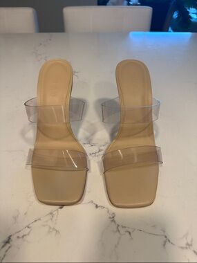 Transparent double straps with a soft leather beige footbed. Sculptural gold-tone structured bamboo heel adds a luxe touch. Sleek, minimalist silhouette. Versatile for day or night. Will be sure to turn heads.