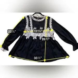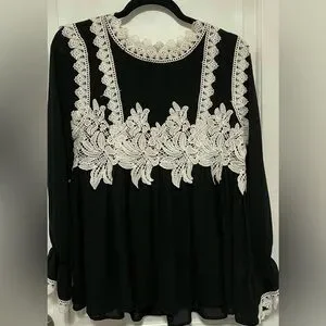 This elegant black top features intricate lace trim, perfect for adding a touch of sophistication to any outfit. Ideal for both casual and formal occasions.