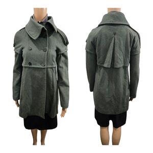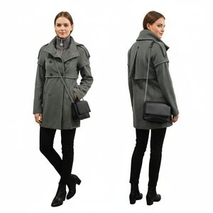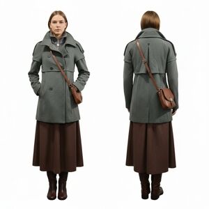 Elevate your outerwear with this architecturally stunning Patrizia Pepe coat. Featuring a sophisticated olive/sage green hue, this piece combines the structured look of a military trench. Its most striking feature is the layered storm flap that wraps around the shoulders and a dramatic inverted box pleat at the back, creating a beautiful silhouette from every angle.