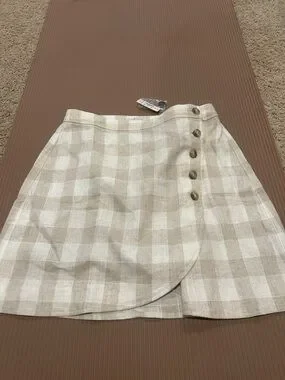 Checked mini skirt with a soft wrap-front look. Side decorative buttons add charm. Lightweight woven fabric for easy wear. Neutral tones pair well with many tops.