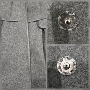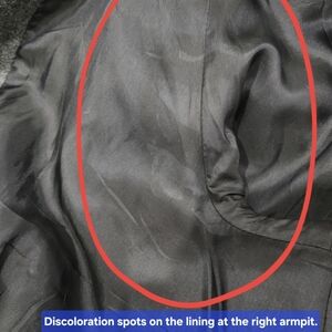 Signs of minor general wear throughout. There might be some loose threads that I didn't notice, minor pilling, and discoloration spots on the lining at the right armpit sleeve. A few snap buttons were tightened with different colored thread (picture included and reflected in the price).