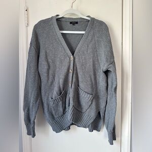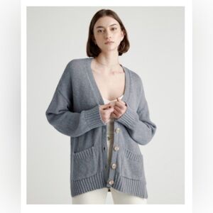 Quince oversized cardigan with button-front closure. Features front patch pockets and ribbed cuffs and hem. Soft knit drape for easy layering and relaxed fit. I typically wear a large and this medium is still a little oversized on me.