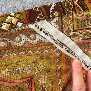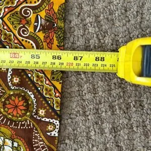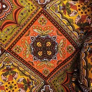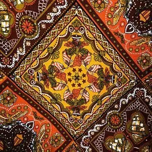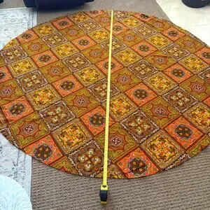 This stunning vintage round tablecloth features a bold Americana-inspired print with patriotic motifs including eagles, ships, stars, and shields. The rich warm color palette of orange, brown, gold, and red adds a vibrant mid-century boho vibe to your kitchen or dining space. Handmade with care, this oversized tablecloth measures 86 inches in diameter, making it perfect for large round tables or as a decorative accent piece.