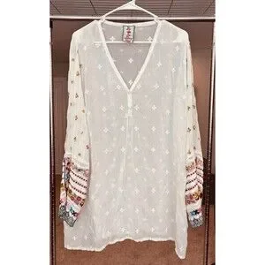 Beautiful sheer Johnny was tunic in white with Boho and embroidered floral sleeves. Great with a cami underneath or over a swimsuit,