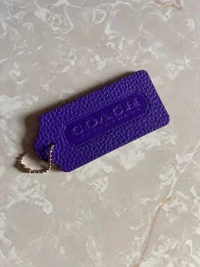 Genuine Coach pebbled leather latge tag. Embossed Coach logo on front. Detachable gold-tone ball chain. Vibrant purple color. Stylish brand accent for bags.