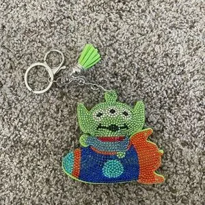 Sparkling green alien keychain with blue and orange crystal rocket details. Includes silver hardware and a lime green tassel. Fun and eye-catching accessory. Great for bags or keys.