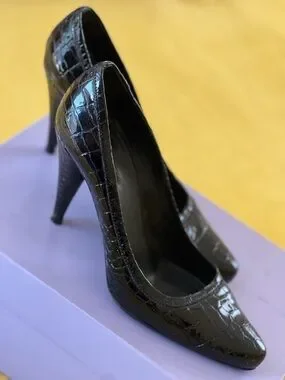 Prada pumps in glossy croc-embossed patent leather. Pointed toe and elegant stiletto heel. Sleek, refined silhouette for dressy occasions. Designer logo visible on the insole.