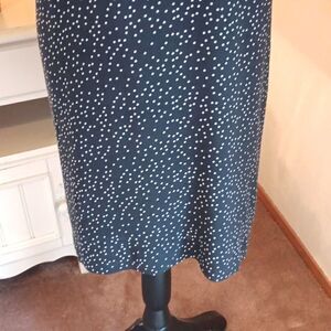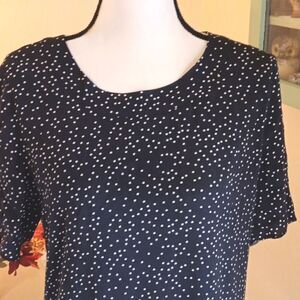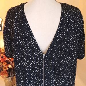 Easy breezy, but a little better, dressy. Soft woven fabric. Fully lined. Boat neck, V in back. Short sleeves. Size 10 measures 42 at chest, 44 at waist, 44 at hips. 37 long from shoulder to hem. The full length zip goes down from the top and up from the bottom. Very cool.