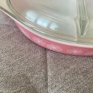 Vintage-style divided Pyrex casserole. Pink base with white daisy pattern. Clear glass lid with built-in divider. Great for serving two dishes at once. Classic oven-to-table design.
