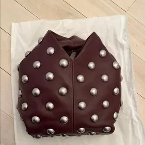 Soft leather hand bag with bold dome silver studs. Rich deep burgundy color. Single top handle for easy carry. Modern, edgy accent hardware. NWT never used includes dust bag.