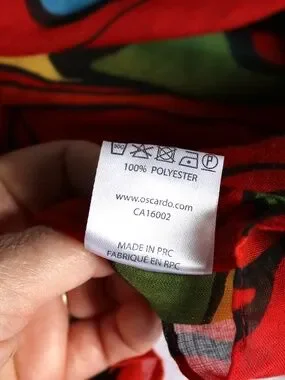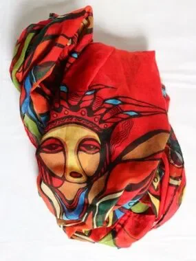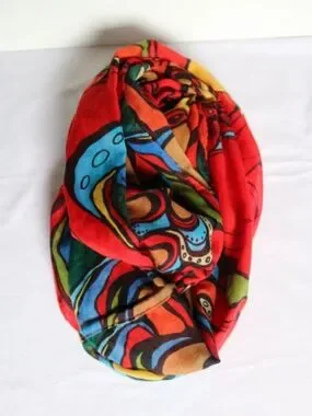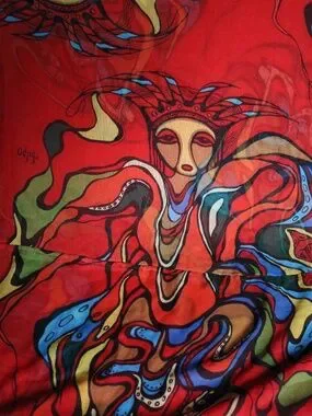 Lovely Oscardo infinity scarf (Pow Wow Dancer) featuring design by Canadian artist, Daphne Odjig. Scarf features a red background and pow wow dancer in colorful blues, yellows and greens. 100% polyester and measures approx. 35" long. Pre-owned but in excellent condition. Smoke-free, pet friendly home!