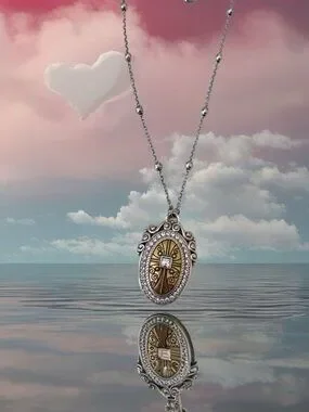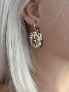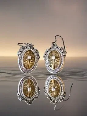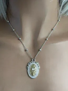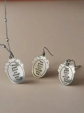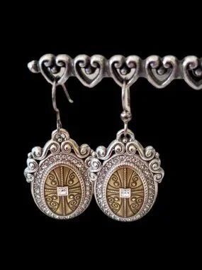 This set features a distinctive oval shape with a centered cross, surrounded by a pavé-style crystal halo and a rope-textured silver. This is a retired set. Very Rare. Adjustable 18 in. Dangle Earrings Comes in a Brighton Bag.