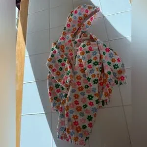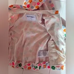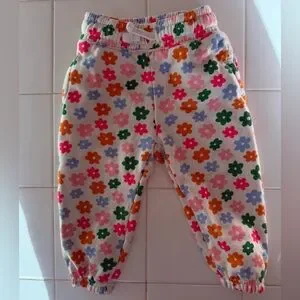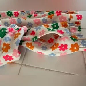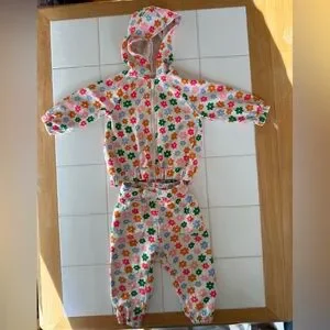 Baby girls 2 piece sweat set from Old Navy. Perfect for this in between season between winter and spring! White with multicolored green, pink, neon pink, blue and orange flower pattern. Wrist and leg/ankle cuffs are elasticized as well as the waistband and bottom hem of the hoodie to keep your little one comfy and well dressed/fit during play.