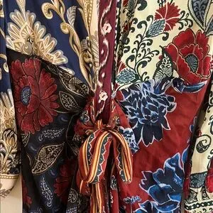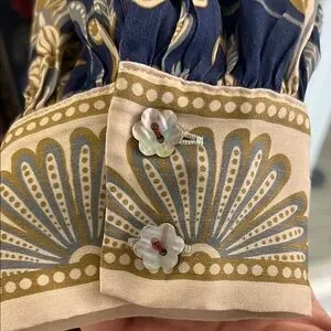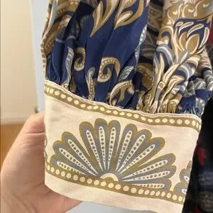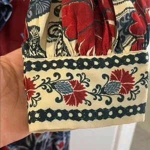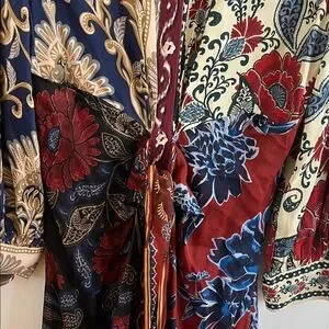 Gorgeous printed midi dress by FARM Rio. Features bold floral and baroque motifs. Long sleeves and a tied waist for shape. There are buttons all the way down in the front and the buttons are beautifully shaped as flowers. Gently used. There is one mark/flaw that’s on the left side/front that’s hard to see unless you look close. I have taken a picture of it and showed it on video. This is a gorgeous dress. Grab it while you can!! 🌸🌸🌸