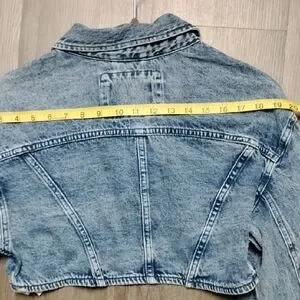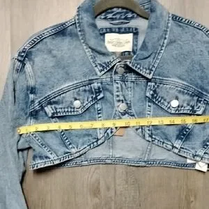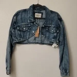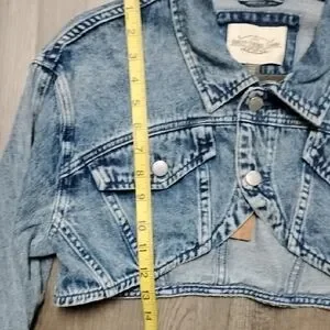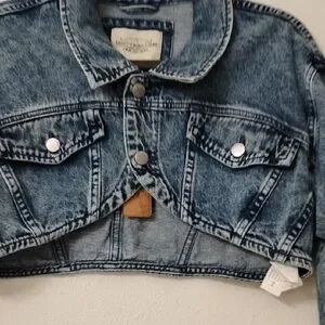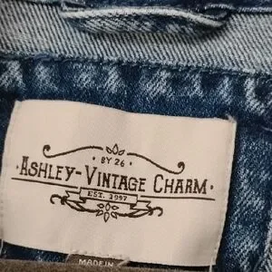 Ashley-Vintage Charm labeled denim jacket. Acid wash blue denim with classic flap pockets and button front. Timeless casual layering piece.